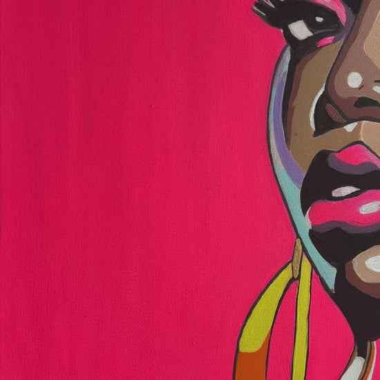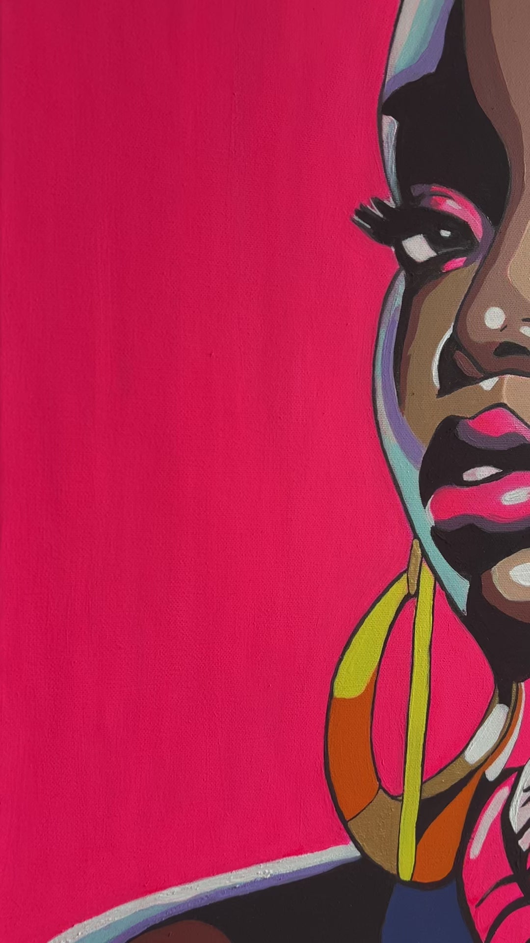 Aminata started with colour and confrontation. The bright pink came first, then her gaze. There’s a softness in the way she sits, but she still makes you look. For me, this piece is about presence. About not shrinking yourself. About knowing your worth without needing to explain it.