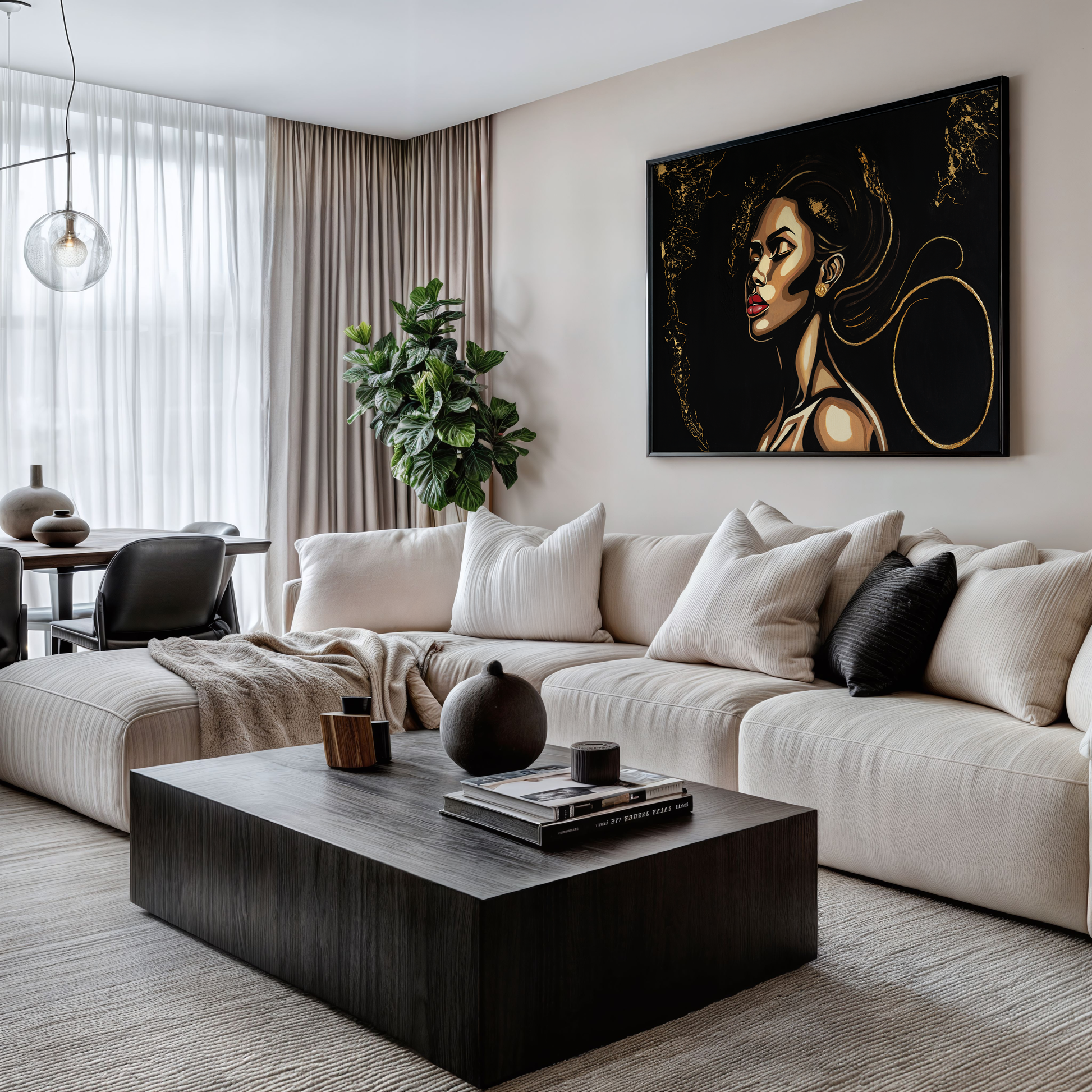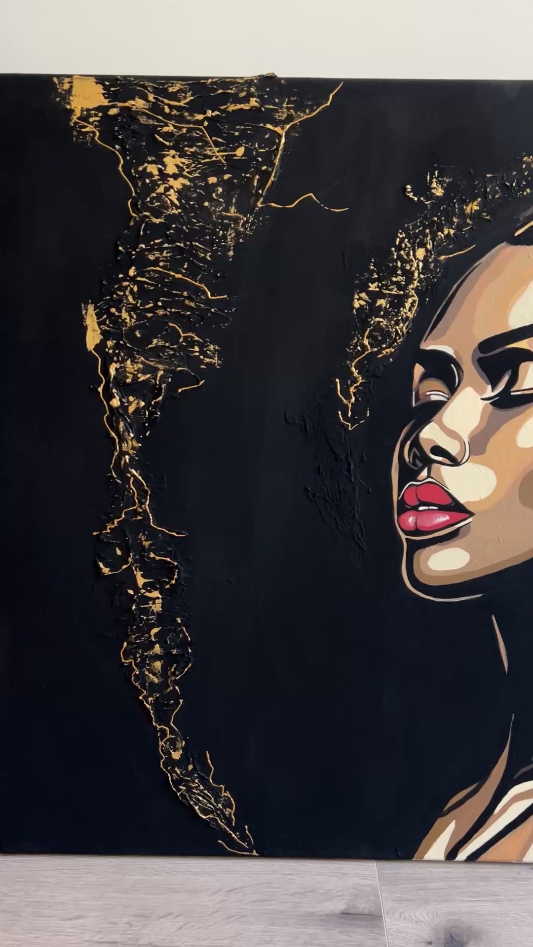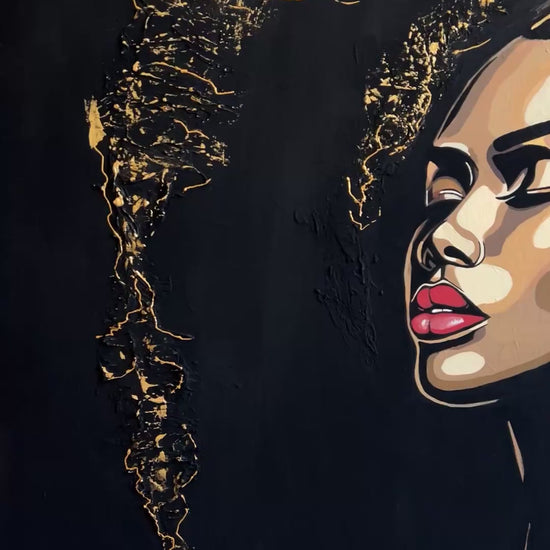 'Cara pa frente' literally means face forward in Cape Verdean Criol. For me, it’s about resilience and about moving forward, even when the world feels heavy. Just taking one step at a time, every day. That’s the feeling I wanted to capture in this painting. The black background brings depth and stillness. I worked with texture paste and gold accents to give the piece something you can really feel. The matte and the shine of the gold come together, just like heaviness and hope do in real life.