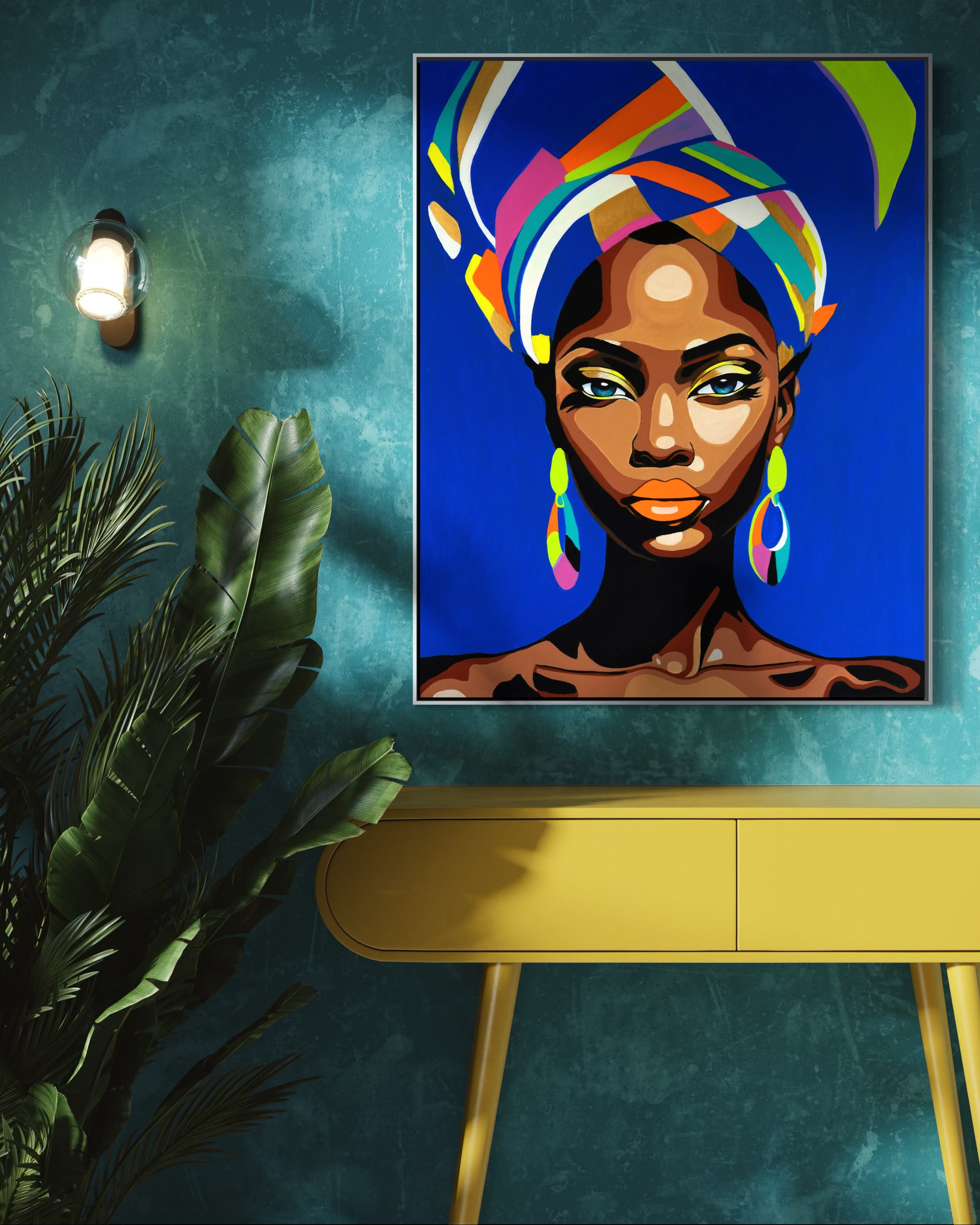 Zaza is an abstract portrait with a deep blue background. The colors in her headwrap and jewelry create strong, complementary contrast and energy. The blue represents the ocean, a symbol of the physical distance between me and my grandmother who lives in Cabo Verde, an archipelago off the west coast of Africa. I named this piece after her. Zaza is about strength, grace and a quiet kind of beauty. Even from far away, she feels close. This painting is a tribute to the love I carry for her.